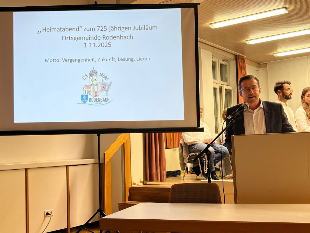 Zur Feier unseres 725-Jahre-Jubiläums lud die Ortsgemeinde Rodenbach am 1. November, dem Tag der ersten urkundlichen Erwähnung Rodenbachs am 1. November 1300, zum Heimatabend unter dem Motto „Vergangenheit – Zukunft – Lesung – Lieder“ ein.